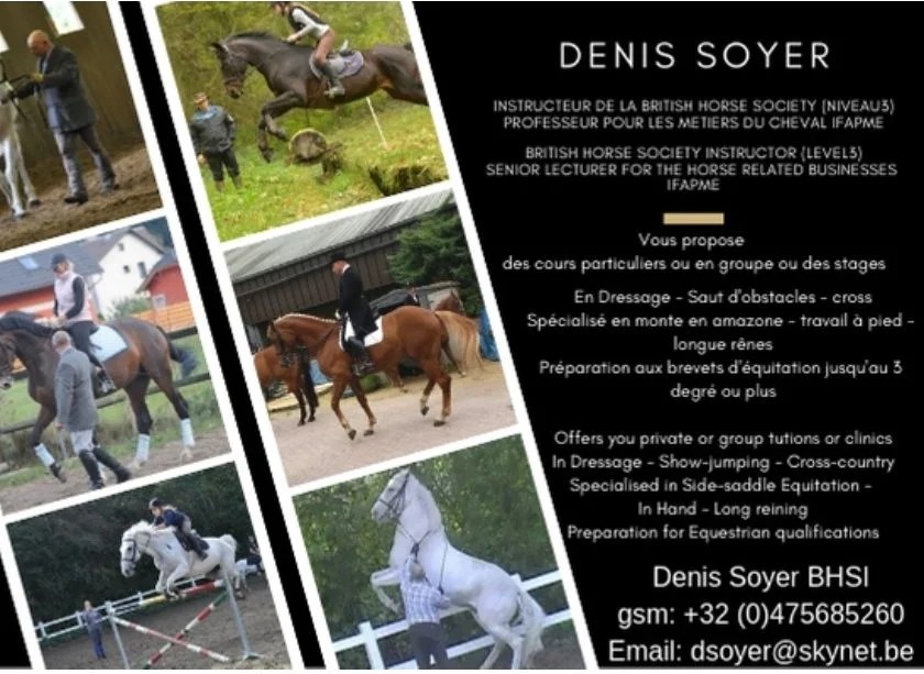 Manège, piste couverte 20/40m, piste extérieur 30x70m avec butte, rond de longe, prairies, promenade et piste de galop en foret de Soignes. Instruction pour cheval et cavaliers, sorties en concours, valorisation.