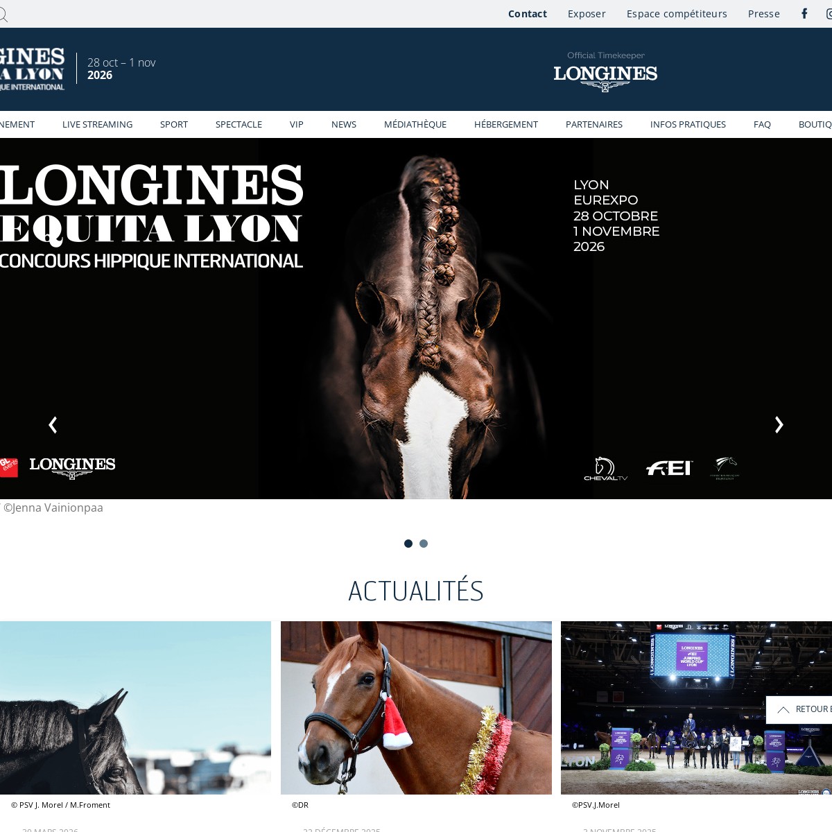 L'édition 2026 de Longines Equita Lyon, le prestigieux salon du cheval et concours hippique international, se tiendra du mercredi 28 octobre au dimanche 1er novembre 2026. L'événement se déroulera, comme à l'accoutumée, à Eurexpo Lyon, proposant des compétitions FEI, des spectacles et un grand salon commercial.