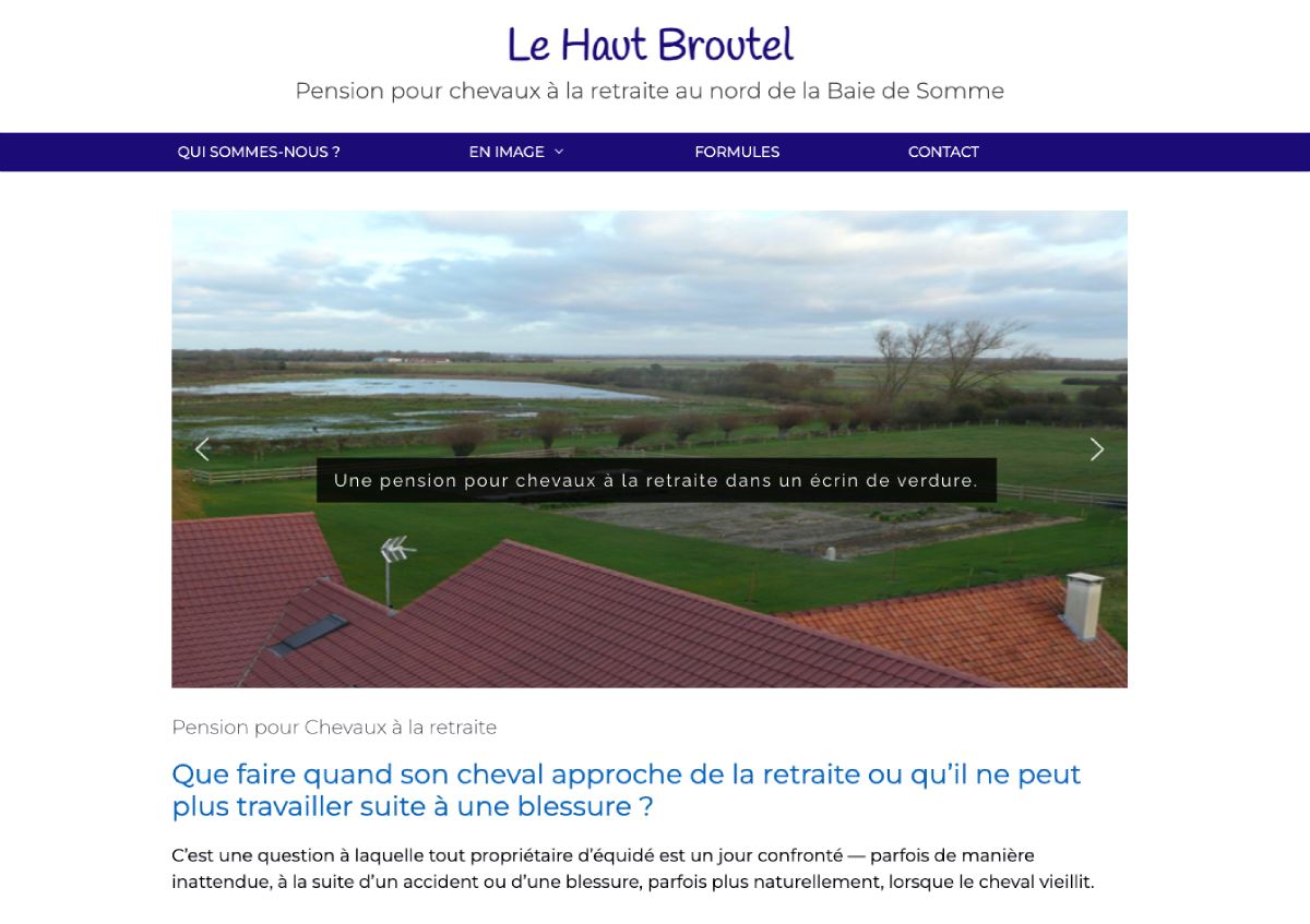 Le Haut Broutel est une pension dédiée aux chevaux à la retraite, implantée dans un environnement naturel préservé, à quelques kilomètres de la mer, au nord de la Baie de Somme. La structure accueille les chevaux qui arrivent en fin de carrière sportive ou qui ne peuvent plus travailler, en leur proposant un cadre paisible et adapté à cette nouvelle étape de leur vie.